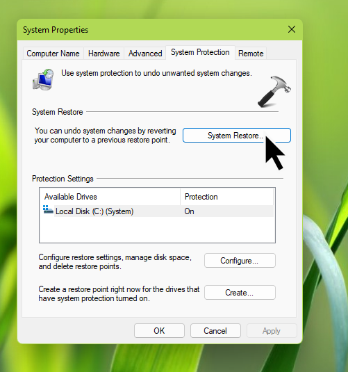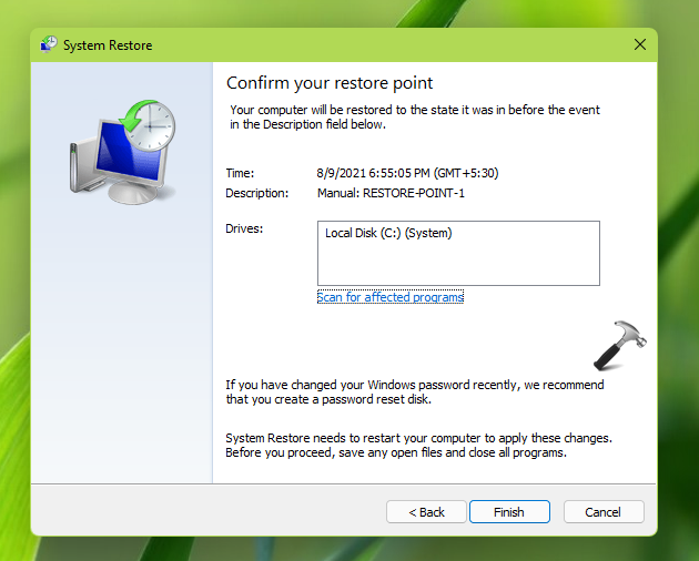 Anteriormente hemos vistocómo crear un punto de restauración del sistema en Windows 11. Ahora, en esta guía, veremos cómo restaurar su Windows 11 a una fecha anterior. Restaurar su sistema a una fecha anteriornoafectar archivos personales en su carpeta de usuario (se puede acceder a esta carpeta cuando ejecuta%UserProfile%dominio). Sin embargo, el proceso de Restauración del sistema eliminará el software o las aplicaciones, las actualizaciones y los controladores instalados inmediatamente después de crear el punto de restauración al que desea volver.