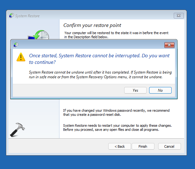 Nota:Antes de hacer clic en Sí, asegúrese de que el sistema tenga suficiente batería o que esté conectado a una fuente de alimentación. Una vez que haga clic en Sí, el punto de restauración al que está restaurando no volverá a estar disponible si Restaurar sistema está actualmente interrumpido.