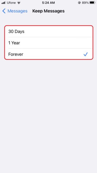 Cualquiera que sea la opción que elijas, ahora se aplicará a los mensajes que envíes y recibas. Tenga en cuenta que esta configuración sólo se aplica a usted. Si la persona a la que le estás enviando mensajes tiene laPara siempreopción seleccionada, sus mensajes no se eliminarán de su dispositivo.