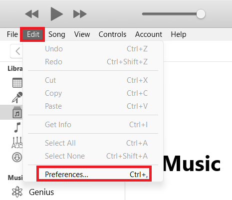 4.Conecte su iPhone a su PC mediante un cable certificado por Apple. Después de eso, haga clic enEditaren la barra de menú y luego elijaPreferencias.