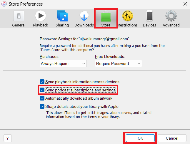 7.Seleccionar "Sincronizar suscripciones y configuraciones de podcasts” y luego confirme haciendo clic enDE ACUERDO.
