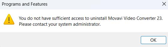 Otra variante de no poder desinstalar un programa es cuando este aparece listado en la listaPanel de controlpero muestra que no tienes permisos administrativos. Es posible que reciba un error como se muestra en la siguiente captura de pantalla: