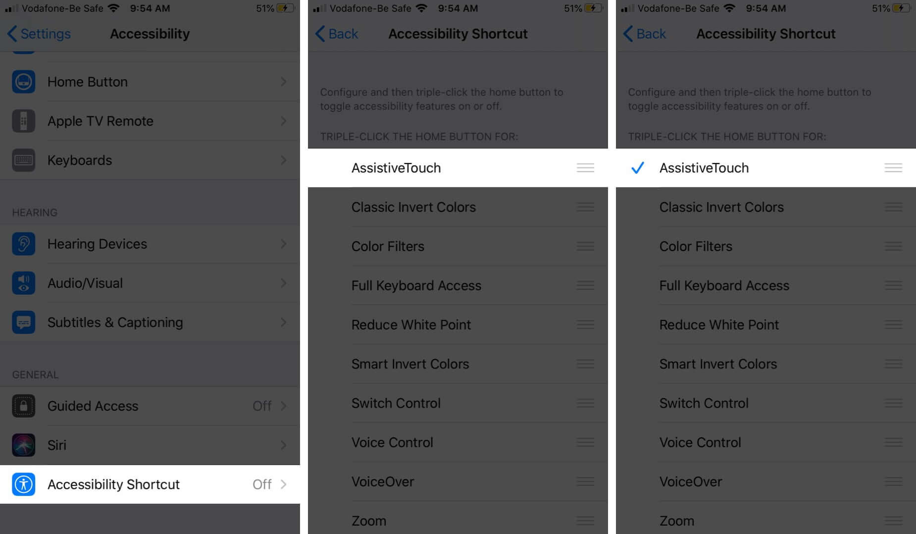 Y si ha agregado AssitiveTouch a los atajos de accesibilidad, simplemente presione el botón de inicio o de encendido tres veces.
