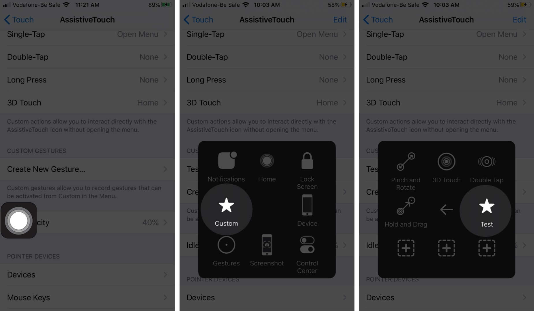 Para probar el gesto, toqueBotón táctil asistido→Costumbre→nombre del gesto.