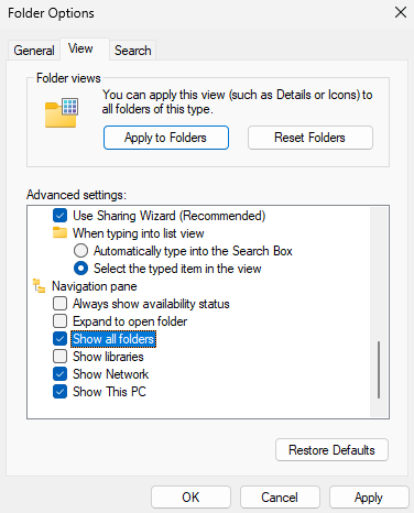Paso 2-A continuación, cambie a la pestaña Ver y haga clic en Mostrar todas las carpetas desde abajo.