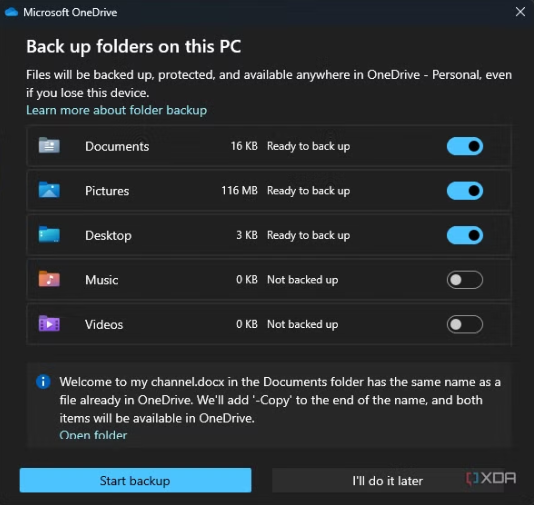 Paso 2-A continuación, seleccione las carpetas necesarias para realizar una copia de seguridad en OneDrive y seleccione Iniciar copia de seguridad.