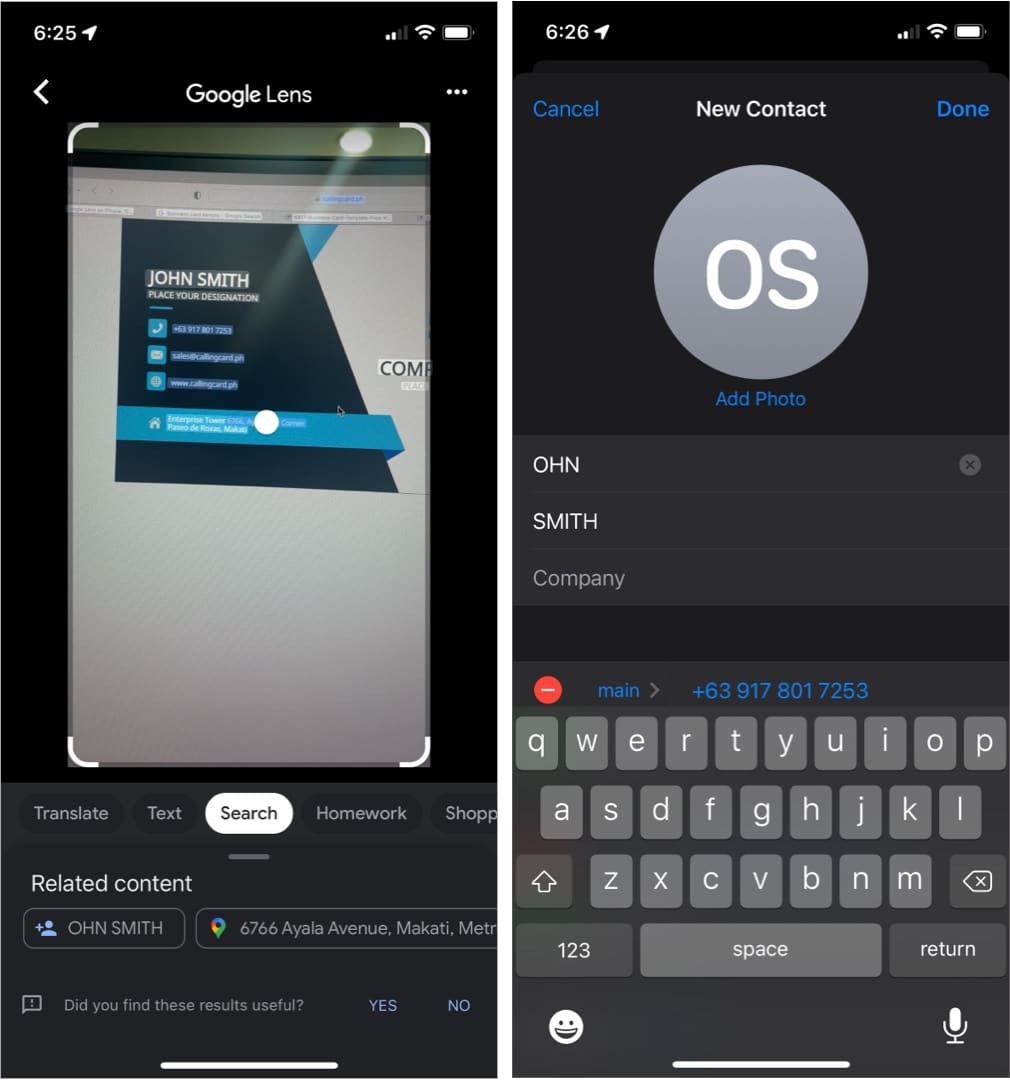 ¿Alguien te entregó una tarjeta de presentación? En lugar de ingresar manualmente sus datos en su teléfono, puede escanear la tarjeta y dejar que Google Lens detecte la información del contacto. Aparecerá un mensaje pidiéndole que cree un contacto tocando+[nombre]bajoContenido relacionado.