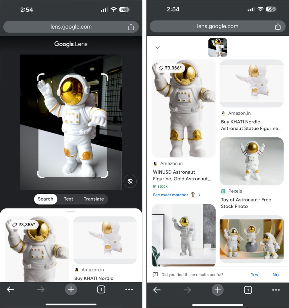 La pestaña Compras funciona como Buscar. Sin embargo, en lugar de mostrarle todos los resultados de la búsqueda, los filtra y muestra solo los resultados de la búsqueda de productos. Esto le permite encontrar productos similares u otros productos que se ajusten a la palabra clave donde se encuentra la imagen original.
