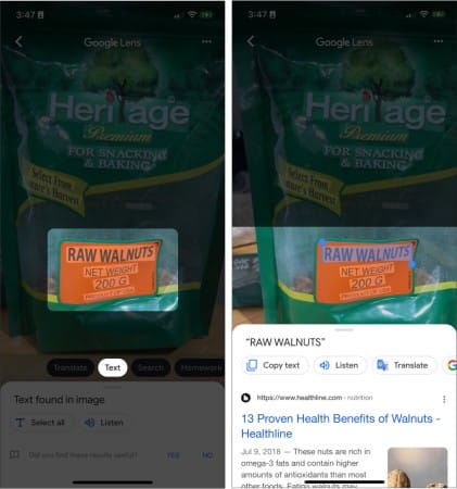 Esta opción le permite tomar una fotografía del texto del entorno y usar parte o la totalidad del mismo en la imagen. Simplemente resalte el texto y Google Lens le mostrará inmediatamente resultados de búsqueda basados en él. Arrastre los resultados de la búsqueda hacia arriba para verlos en pantalla completa. Toca elflecha hacia abajojunto al texto para regresar a la vista de la cámara.