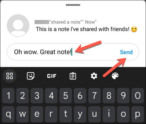 - La nota aparecerá desde la parte inferior, permitiéndole verla en su totalidad. También verá aparecer su teclado para que pueda enviar un mensaje en respuesta.