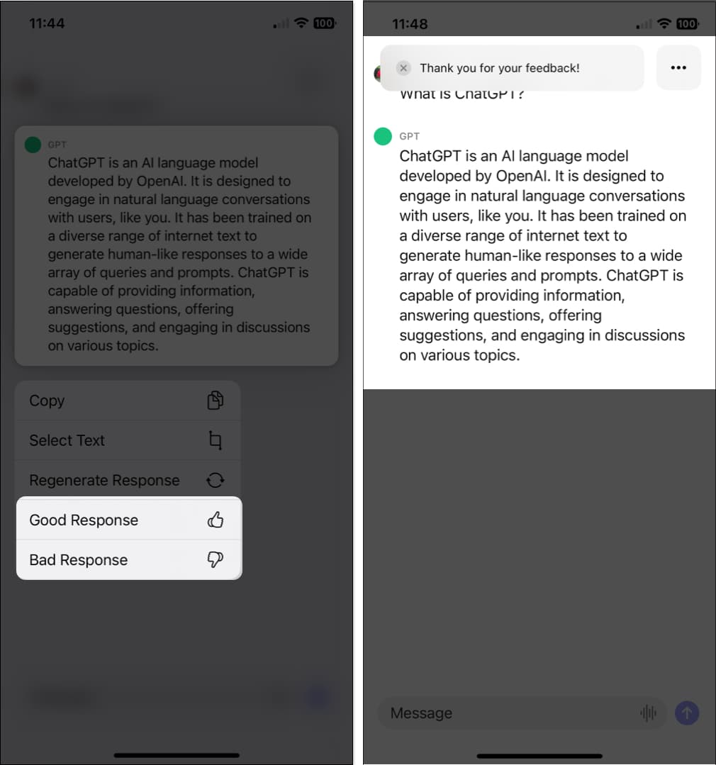 Mantenga presionada la respuesta y elijaBuena respuestaoMala respuesta. Luego verá un breve mensaje en la parte superior agradeciéndole sus comentarios.
