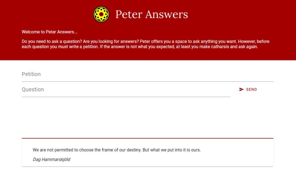 Peter Answers (también conocido como Ask Peter) es un sitio web presentado como un sitio de tarot virtual. Normalmente, los sitios de tarot virtuales son aquellos que utilizan las cartas del tarot para predecir tu futuro. Todo lo que tienes que hacer es escribir una pregunta que te gustaría saber sobre el futuro y Peter te dará la respuesta.