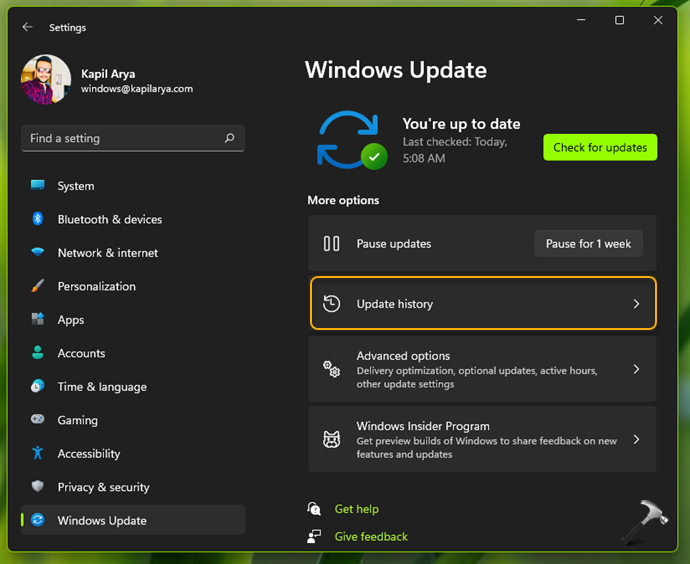 2.Ir aActualización de Windows. En el panel derecho, haga clic enHistorial de actualizaciones.