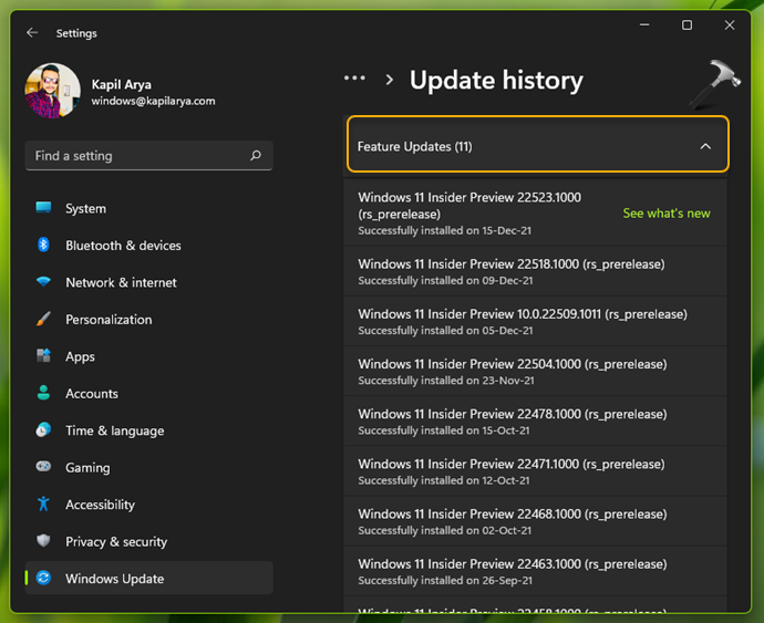 3.En Historial de actualizaciones, las actualizaciones instaladas se clasifican según el tipo al que pertenecen. La siguiente captura de pantalla muestra cómo se muestran las actualizaciones de funciones.