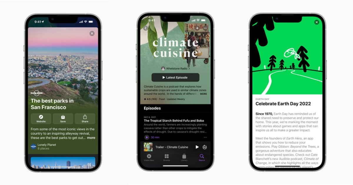Para celebrar el Día de la Tierra el 22 de abril de 2022, Apple lanzó un entrenamiento Time to Walk, agregó nuevas guías de Apple Maps y planea exhibir libros, aplicaciones y podcasts especialmente seleccionados para ayudar a los clientes a “explorar la belleza del mundo natural, aprender sobre los problemas urgentes que enfrentan las comunidades en todo el mundo debido al cambio climático y tomar medidas para proteger el planeta”.