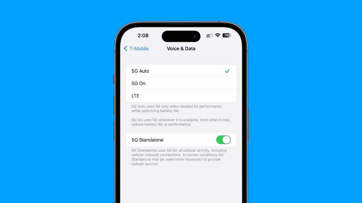 La próxima actualización de iOS 16.4 mejorará la experiencia 5G al admitir iPhones con la nueva función 5G Standalone para operadores compatibles. Según la imagen compartida por 9to5Mac, la nueva función de suscripción se agrega a las secciones de Voz y Datos de la aplicación T-Mobile, junto con otras opciones de conectividad.