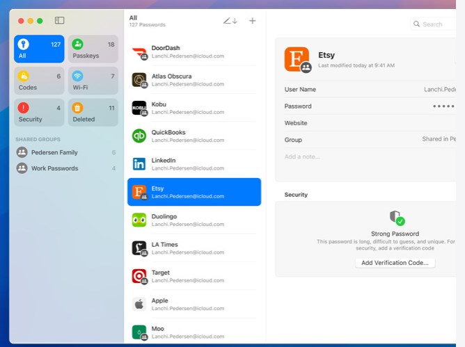 La nueva aplicación Contraseñas le permite crear contraseñas seguras para sus cuentas, almacenar credenciales existentes, códigos de verificación, claves de acceso y utilizarlas para iniciar sesión rápidamente en sitios web. Las contraseñas se sincronizan en todos sus dispositivos. Es compatible con Autocompletar. La aplicación Contraseñas está disponible en macOS, iOS, iPadOS, Vision OS e incluso en Windows con la aplicación iCloud para Windows.