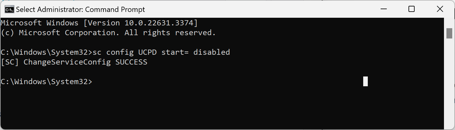- Ejecute el siguiente comando:sc config UCPD inicio = deshabilitado