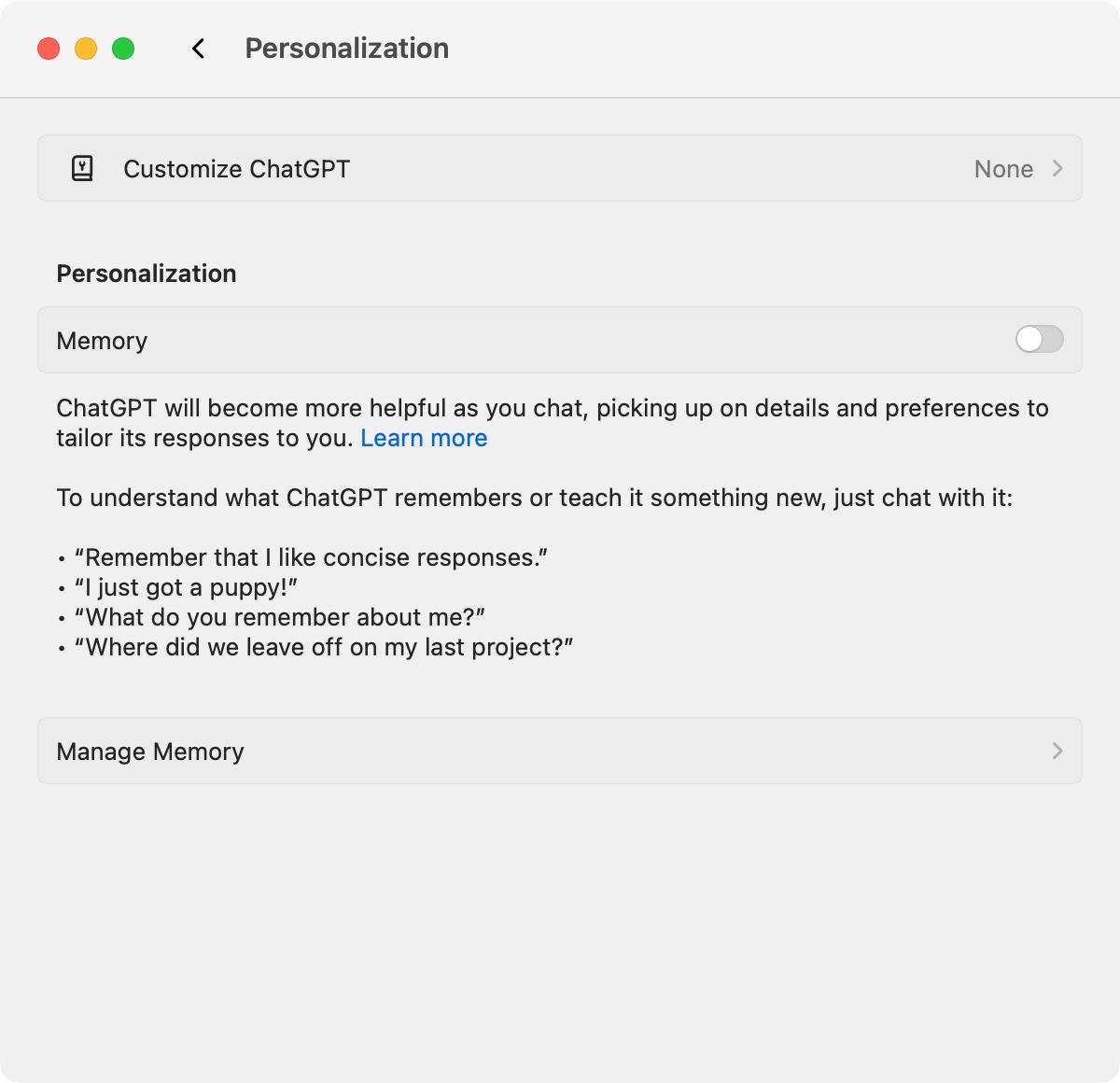La aplicación ChatGPT puede recordar tus chats, aprender de ellos y utilizar los datos para adaptar sus respuestas a ti. Esta función se llama Memoria y no está habilitada de forma predeterminada.