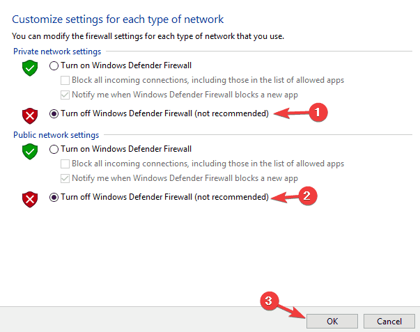 - Ahora seleccioneDesactive el Firewall de Windows Defender (no recomendado)para configuraciones de red pública y privada.