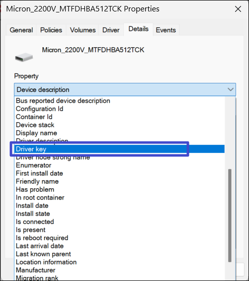 3. En la ventana Propiedades, cambie a "Detalles"Pestaña y elija"llave del conductor" del "Propiedad”desplegable.