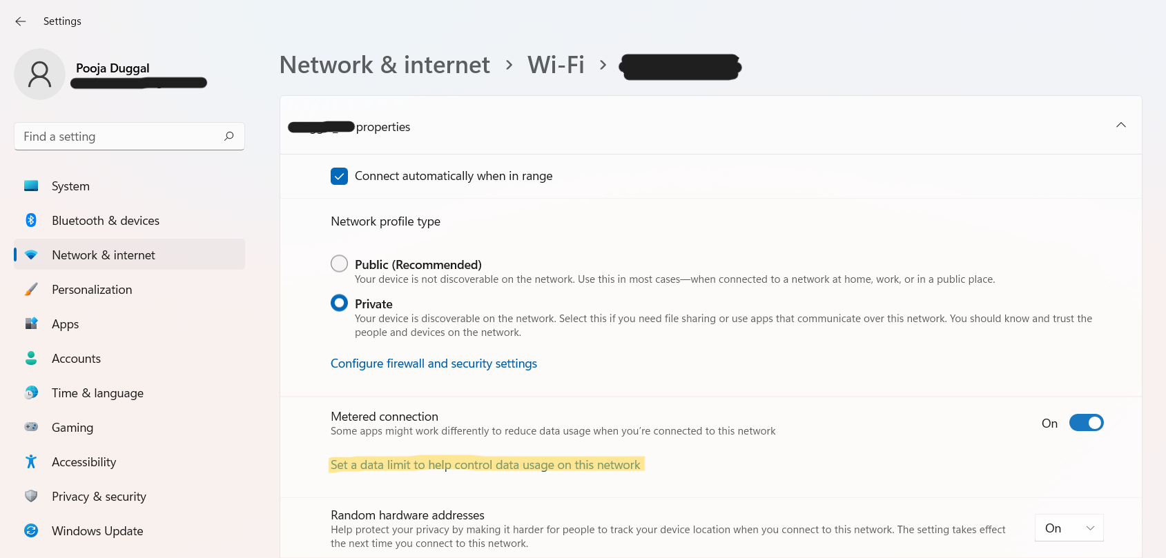 1.Para configurar el uso de datos, haga clic enEstablecer un límite de datos para ayudar a controlar el uso de datos en esta red. Esta opción está presente debajo delConexión medidapestaña.