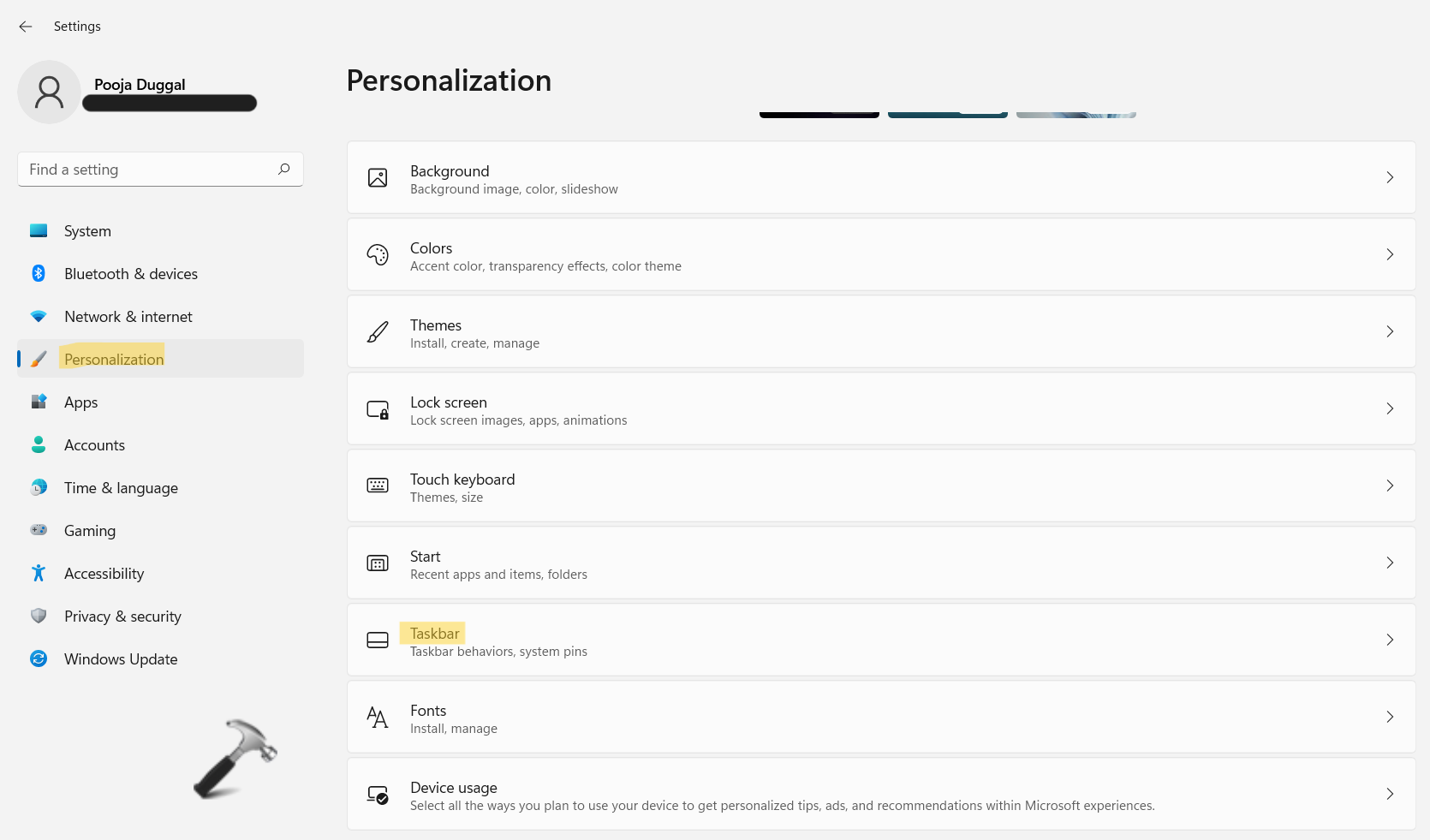 1.Abre elAjustesaplicación presionando el botónventanas + yopestañas juntas en su teclado y vaya a laPersonalizaciónpestaña. Después de eso, haga clic en Barra de tareas presente en el lado derecho.