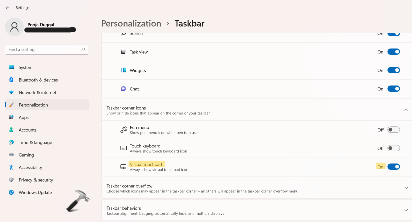 2.Después de eso, haga clic en elPanel táctil virtualopción presente bajoIconos de las esquinas de la barra de tareas. Si mueves el interruptorEn, mostrará el panel táctil virtual. O bien, active el interruptorApagadopara ocultar el panel táctil virtual.