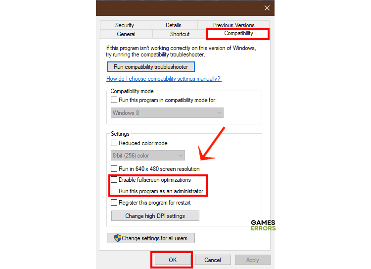 - Compruebe elDeshabilitar optimizaciones de pantalla completacaja.