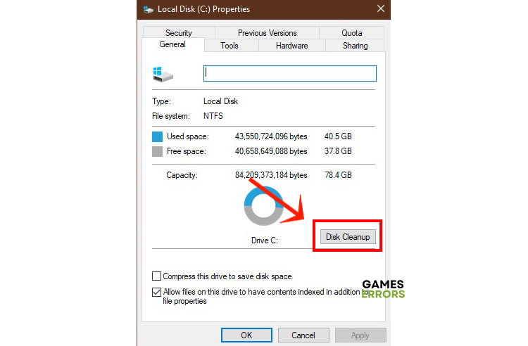 - En la pestaña General, haga clic enLimpieza de discobotón.