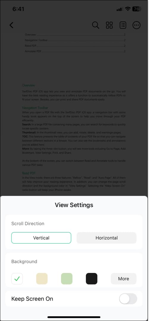 Al visualizar un PDF extenso, puede saltar directamente a la página deseada. Además, le permite cambiar la dirección de desplazamiento de las páginas PDF y cambiar el color de fondo para una mayor personalización. Mientras leía libros electrónicos, activé la opción Mantener pantalla encendida para evitar interrupciones.
