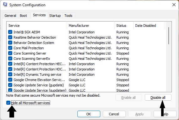 4. Ahora, bajoServiciospestaña, haga clic en la casilla de verificación al ladoOcultar todos los servicios de Microsoft, seguido de seleccionarDesactivar todobotón.