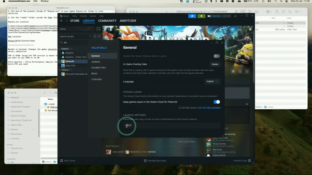Otro paso importante es agregar la carpeta Mods a la carpeta Packs dentro del directorio de instalación de Palworld. Esto implica navegar por el entorno CrossOver, encontrar la carpeta de instalación de Steam y colocar las modificaciones de forma adecuada.