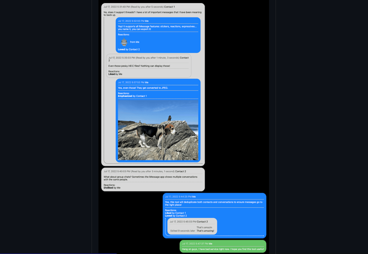 He pasado mucho tiempo realizando ingeniería inversa en casi todos los aspectos de las tablas iMessage SQLite de Apple para crear este programa. Hasta donde yo sé, no existen otras herramientas que admitan el corpus completo de funciones de iMessage, incluidos mensajes editados, mensajes de aplicaciones, reacciones e hilos.