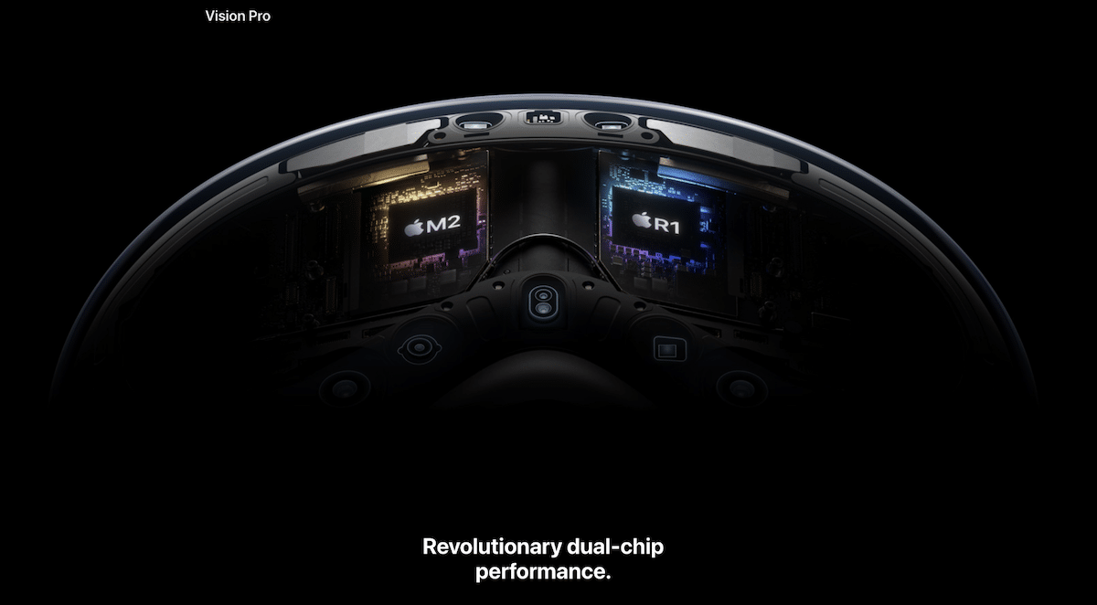 El chipset R1 de Apple puede procesar rápidamente las entradas espaciales de los sensores del dispositivo y brindar a los usuarios una experiencia tridimensional sin demoras. El R1 permitiría al dispositivo procesar todas las entradas en 12 milisegundos, ocho veces más rápido que un abrir y cerrar de ojos.