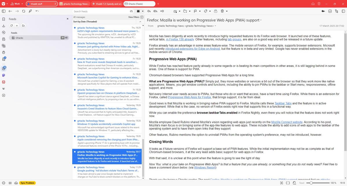 Puede acceder a las fuentes RSS desde el panel lateral de Vivaldi.