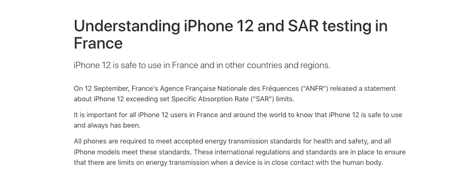 - Limitar la radiación para el iPhone 12 en Franciapara cumplir con los estándares de Tasa de Absorción Específica (SAR) en el país al reducir la “potencia cuando está fuera del cuerpo en una superficie estática”. La Agence Française Nationale des Fréquences (“ANFR”) de Francia había amenazado con prohibir el iPhone 12 por exceder los límites específicos de SAR establecidos. Lea sobre esto en detalle aquí.