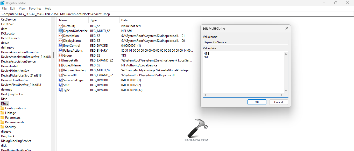 HKEY_LOCAL_MACHINESYSTEMCurrentControlSetServicesDhcp