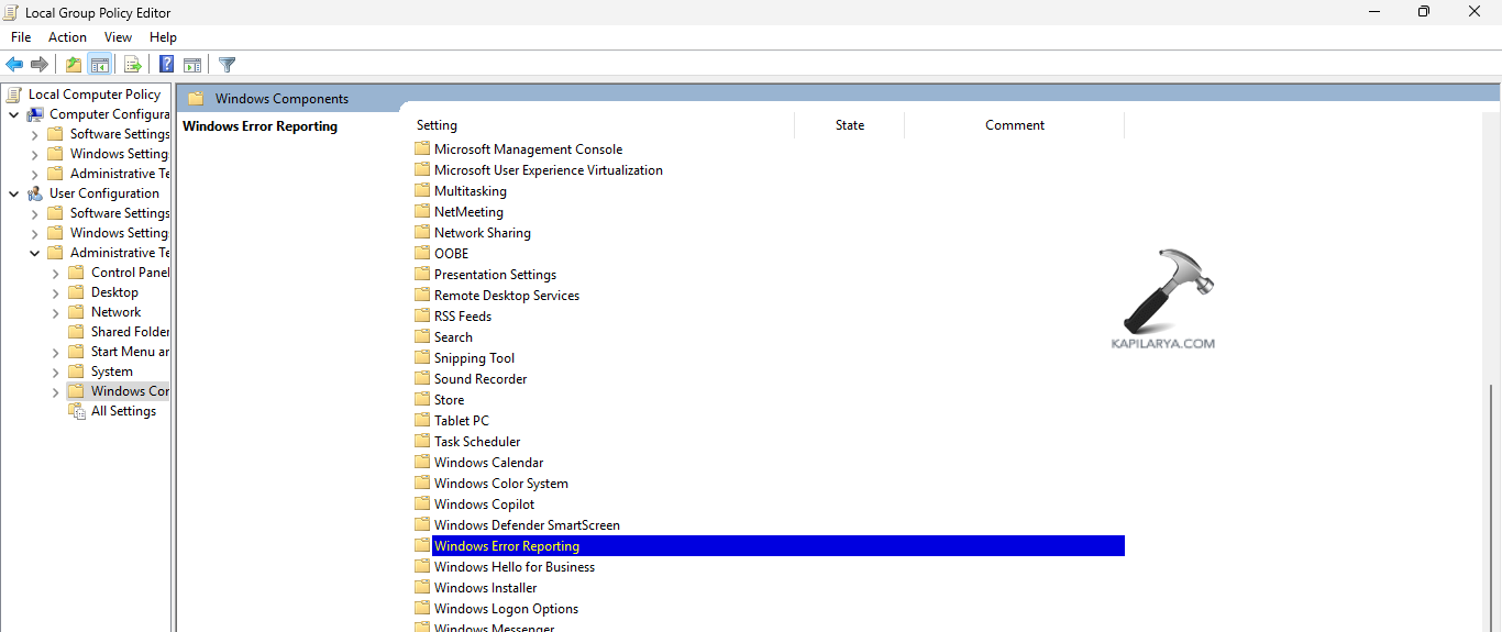 Paso 2-A continuación, en la ventana del Editor de políticas de grupo, vaya a Configuración de usuario > Plantillas administrativas > Componentes de Windows > Informe de errores de Windows.