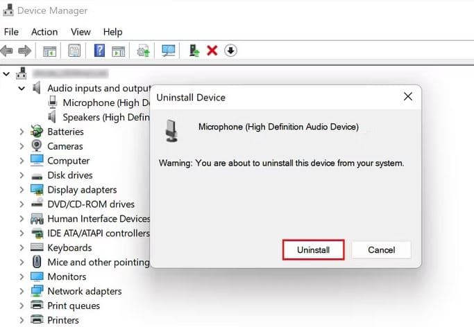 - Fai clic con il pulsante destro del mouse sul dispositivo di destinazione nella sezione Ingressi e uscite audio e scegli Disinstalla dispositivo dal menu contestuale.