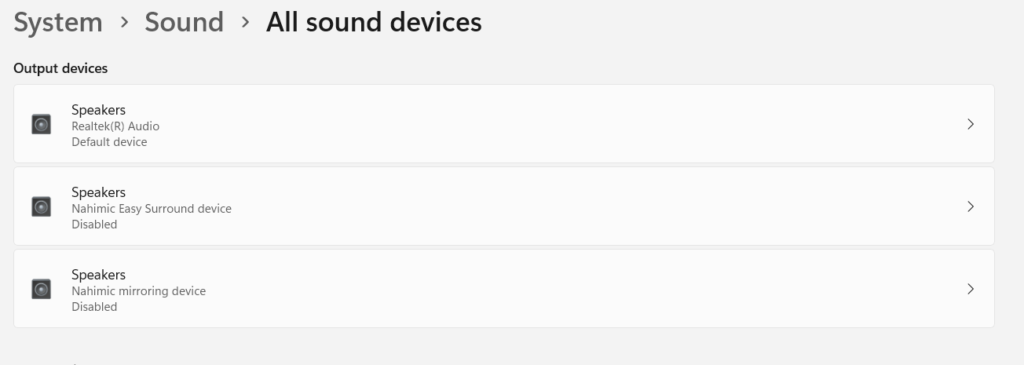 3.Sotto ilDispositivi di uscitasezione, scegli un dispositivo audio per accedere alla sua sezione delle proprietà.
