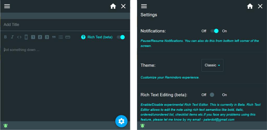 Puoi regolare le impostazioni del tema, goderti un aspetto gradevole dell'interfaccia e ricevere i promemoria in tempo con Remindoro.