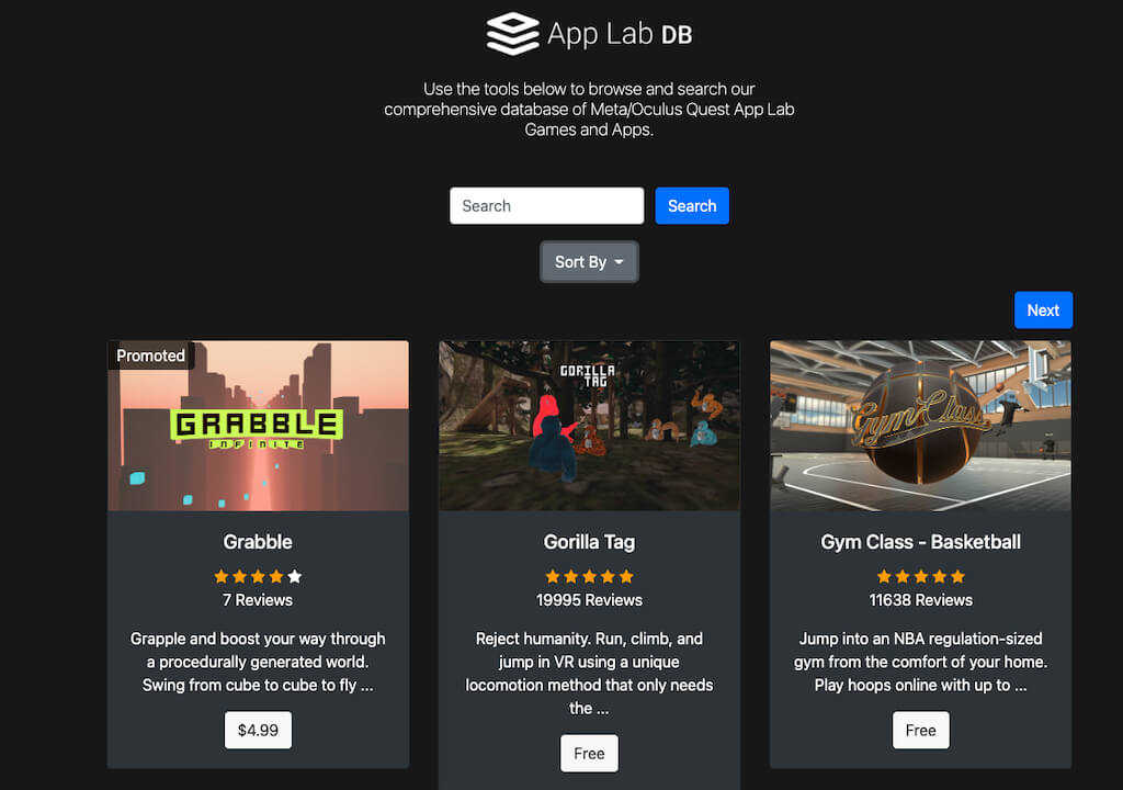 App Lab DB è un database funzionante di tutti i giochi App Lab conosciuti. Ti consente di ordinare per popolarità, età, valutazione e persino prezzo. Puoi anche cercare titoli specifici. Alcuni dei giochi Quest 2 più famosi di oggi (come Gorilla Tag) hanno avuto inizio su App Lab.