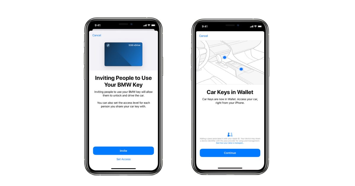Apple ha presentato Car Keys alla WWDC 2020, una copia digitale delle chiavi dell'auto archiviate nell'app Wallet su iPhone e Apple Watch. Le chiavi digitali dell'auto sono dotate della tecnologia NFC che consente agli utenti di chiudere, sbloccare e avviare facilmente la propria auto tramite iPhone e Apple Watch ed elimina la necessità di portare con sé la chiave fisica. Le chiavi digitali possono anche essere condivise con familiari o amici tramite app di messaggistica come Messaggi, Mail, WhatsApp e AirDrop e gestite tramite iCloud.