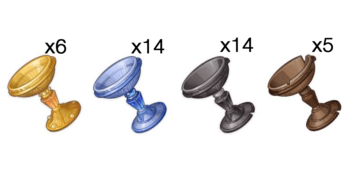- Insegne stupide: Come con gli altri personaggi Fatui, Arlecchino richiede che questi vengano lasciati dai mob Fatui. Avrai bisogno di 36 insegne di recluta, 96 di sergente e 129 di tenente.