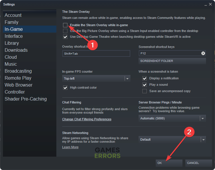 - DeselezionaAbilita l'overlay di Steam durante il giocoe quindi fare clic suOK.
