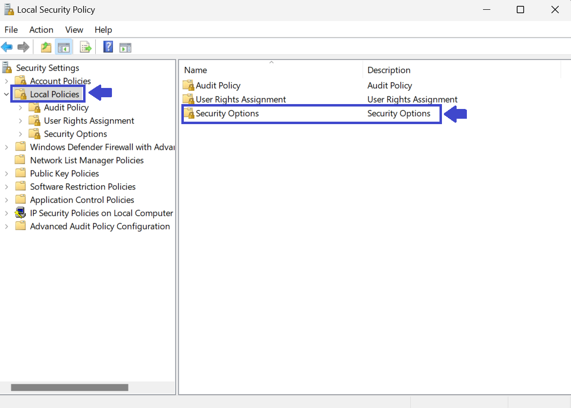 2. Vai su Criteri locali e seleziona Opzioni di sicurezza.