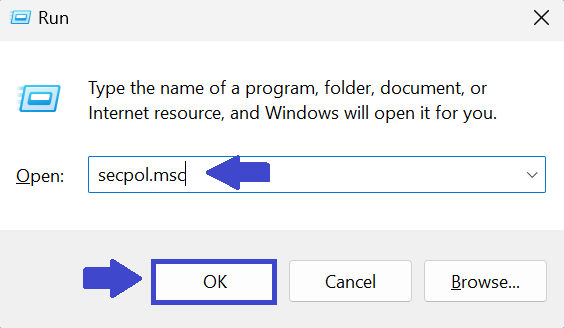 1. Premere il tasto Windows + R. Digitare Secpol.msc e fare clic su OK.
