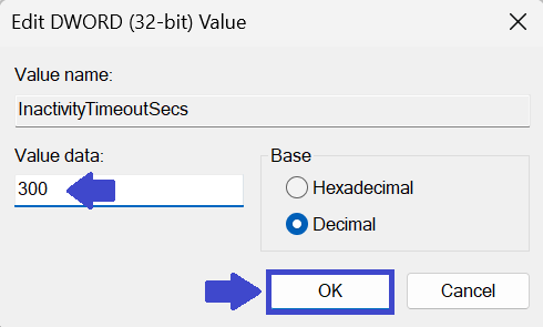 5. Selezionare Decimale e inserire il valore 300. È possibile inserire un numero compreso tra 0 e 599940 per quanti secondi di inattività si desidera bloccare automaticamente il computer.