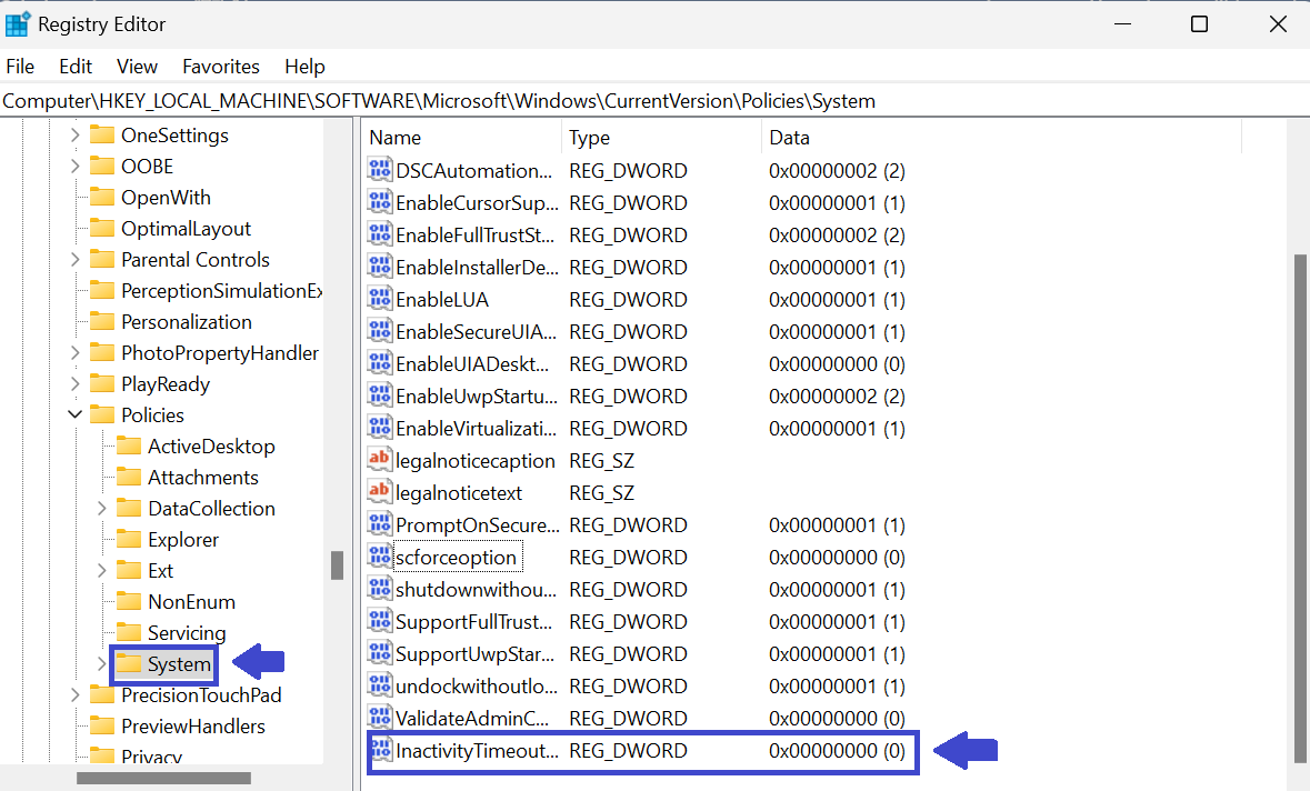 3. Nel riquadro destro della chiave di sistema, fare clic sulla chiave InactivityTimeoutSecs.